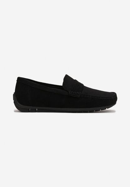 Czarne Półbuty z Ekoskóry w Stylu Mokasynów z Przeszyciami i Kokardą Randaca