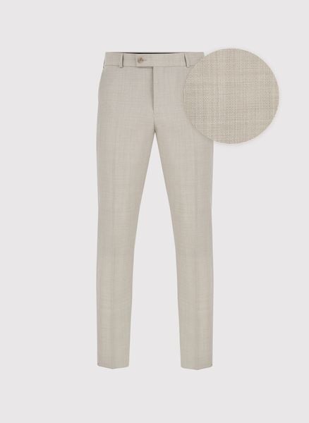 Welniane spodnie garniturowe – Pako Lorente. Wełniane spodnie w kolorze jasnobeżowym. Spodnie w kant. Elegancki beżowy garnitur. Skład: 100% wełna. Premium.
