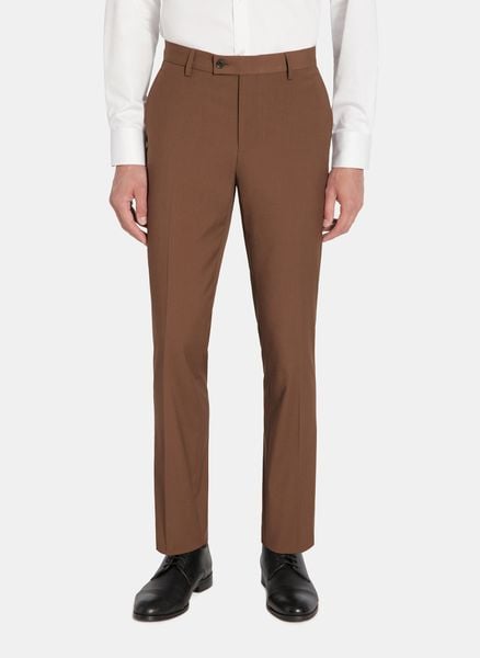 Gładkie brązowe spodnie – Pako Lorente. Ciemne spodnie garniturowe męskie. Spodnie w kant. Biznesowy garnitur. Garnitur dla Pana Młodego. Skład: 69% poliester, 29% wiskoza, 2% elastan. Fason Slim.