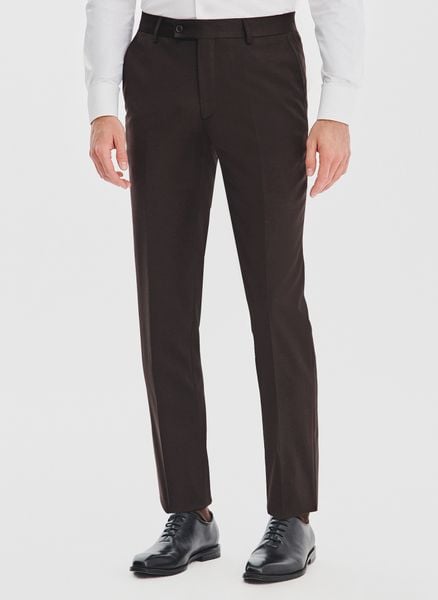 Brązowe spodnie garniturowe – Pako Lorente. Ciemne spodnie garniturowe. Spodnie w kant. Całoroczny biznesowy garnitur. Skład: 50% wełna, 50% poliester. Podszewka: 100% poliester. Fason Super Slim.