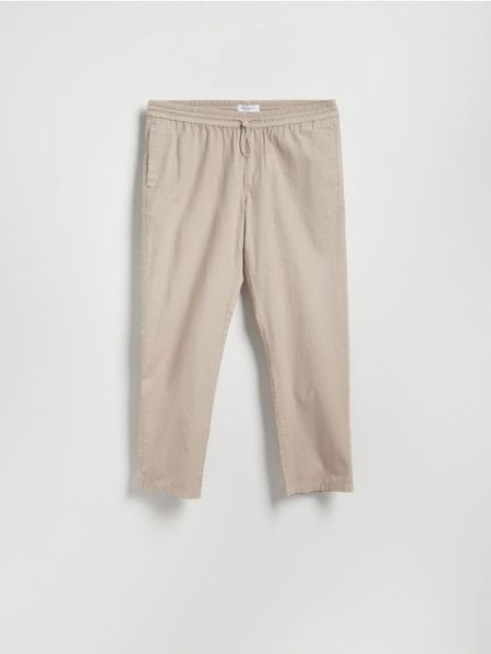 Spodnie typu jogger o swobodnym kroju, wykonane z bawełnianej tkaniny.