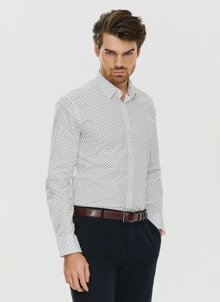 Biała męska koszula w niebieski mikrowzór – Pako Lorente. Koszula z elastanem. Wzorzysta koszula na co dzień. Przewiewna koszula. Koszula do jeansów.
