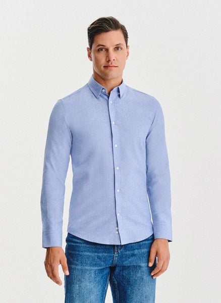 Niebieska koszula melanż – Pako Lorente. Niebieska koszula długi rękaw. Skład: 50% bawełna, 50% poliester. Koszula Slim. Jesienna koszula męska.