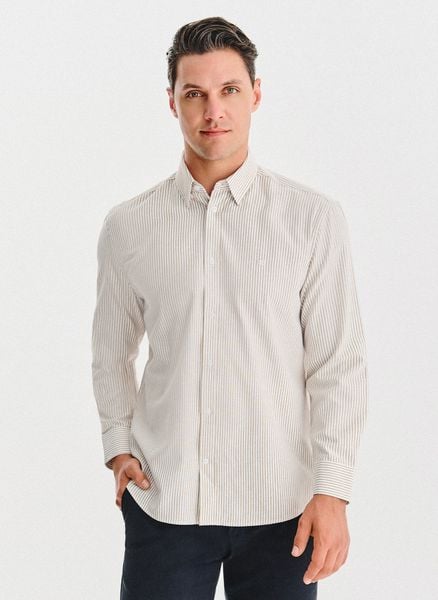 Beżowa koszula w paski – Pako Lorente. Jasna koszula z długi m rękawem. Beżowa koszula w białe paski. Skład: 50% bawełna, 50% poliester. Koszula Regular. Jesienna koszula męska.