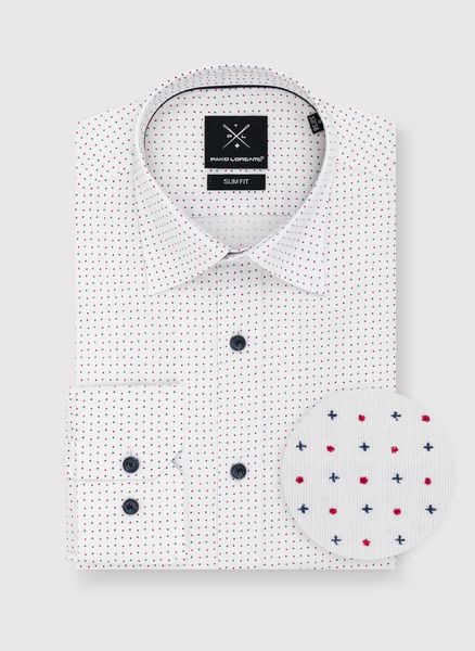 Biała koszula w granatowo-czerwony mikrowzór – Pako Lorente. Koszula męska w mikrowzór. Biała koszula w drobne wzorki. Fason: Slim Fit. Skład: bawełna, elastan