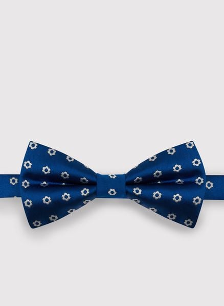 Niebieska mucha męska w srebrne kwiatki Pako Lorente. Elegancki męski dodatek. Mucha do białej koszuli i garnituru. Do stylizacji formalnej. Na ślub, na wesele
