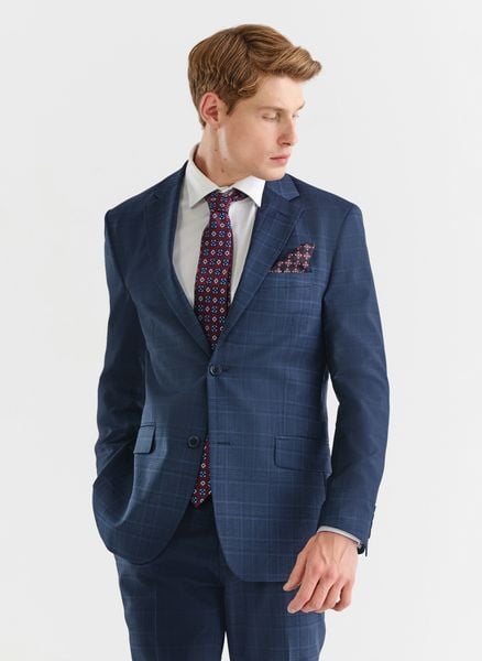 Granatowa marynarka garniturowa w delikatną niebieską kratkę – Pako Lorente. Marynarka z wełną. Elegancka marynarka na ślub, wesele. Fason: Slim Fit.