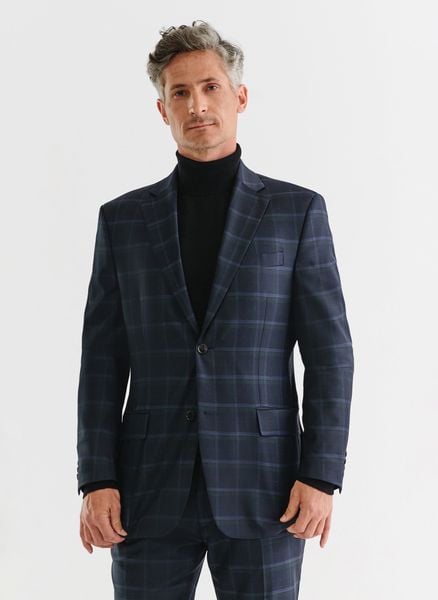Granatowa marynarka garniturowa – Pako Lorente. Granatowa marynarka w kratę. Elegancki garnitur. Jednorzędowa marynarka o kroju Slim Fit. Wełnina marynarka