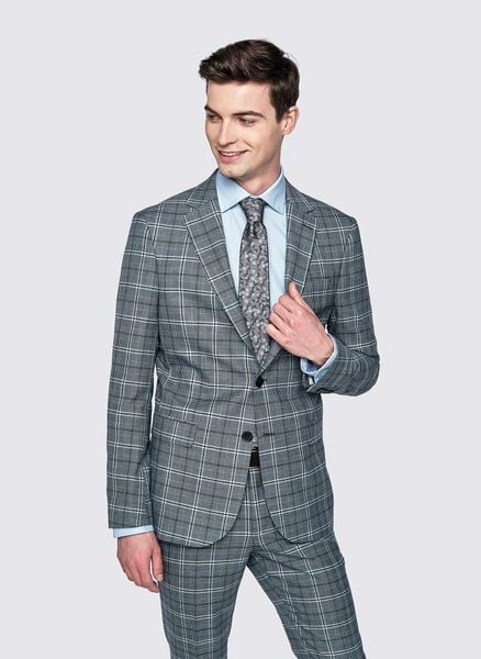 Szara marynarka garniturowa w granatową kratę – Pako Lorente. Jednorzędowa, szara marynarka w rustykalnym stylu. Skład: poliester, wiskoza, elastan