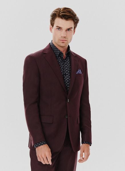 Marynarka garniturowa męska – Pako Lorente. Gładka burgundowa marynarka. Świąteczna marynarka. Fason: Super Slim. Skład: 50% wełna, 50% poliester. Marynarka wełniana.
