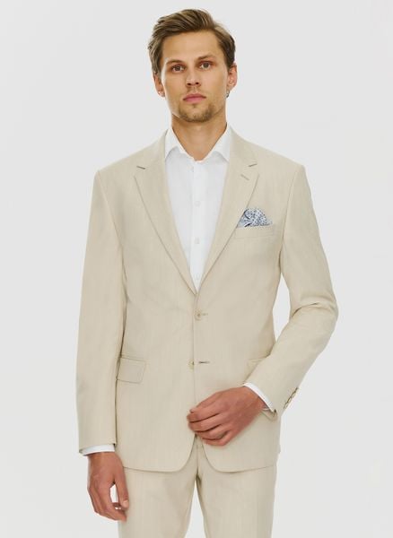 Beżowa męska marynarka garniturowa – Pako Lorente. Męska marynarka w kolorze beżowym. Jasna marynarka. Skład: 54% poliester, 44% wełna, 2% lycra
