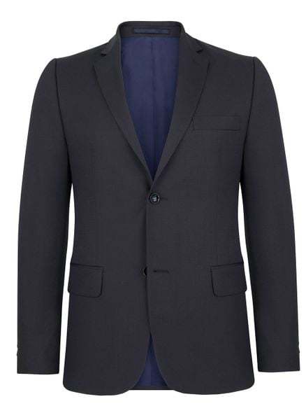 Marynarka garniturowa w kolorze granatowym. Marynarka jednorzędowa, zapinana na dwa guziki. Z tyłu znajdują się dwa szlice, z przodu dwie cięte kieszenie.