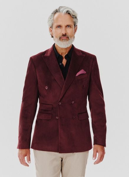 Sztruksowa marynarka męska – Pako Lorente. Bordowa marynarka. Marynarka dwurzędowa. Fason: Slim. Skład: 100% poliester.