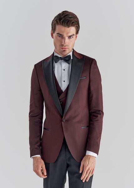 Bordowa marynarka smokingowa – Pako Lorente. Bordowa marynarka z atłasowym kołnierzem. Ślubny garnitur. Smoking na Ślub. Skład: 65% poliester 35% wiskoza