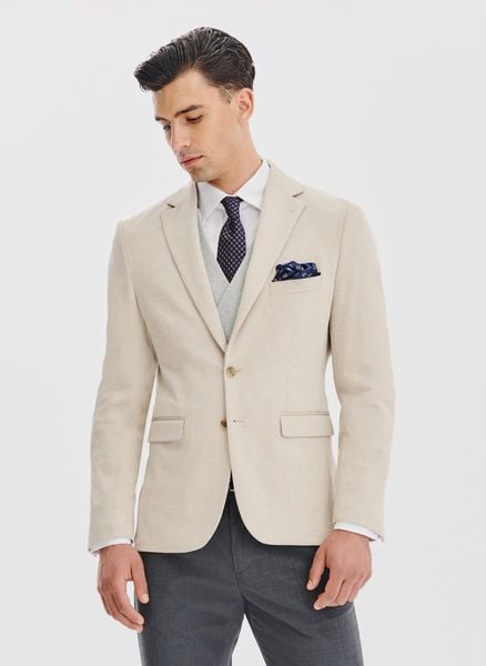 Beżowa marynarka męska – Pako Lorente. Dzianinowa jesienna marynarka. Marynarka w drobną kratkę. Skład: 76% poliester, 16% wiskoza, 8% elastan. Fason Slim. Marynarka jednorzędowa. Marynarka z podszewką.