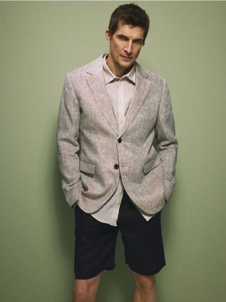 Marynarka o regularnym kroju, wykonana z lnianej tkaniny.