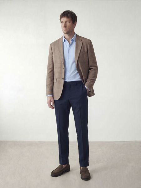 Marynarka o regularnym kroju, wykonana z tkaniny z domieszką lnu.
