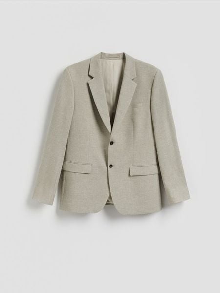 Marynarka o regularnym kroju, wykonana z tkaniny z domieszką lnu.
