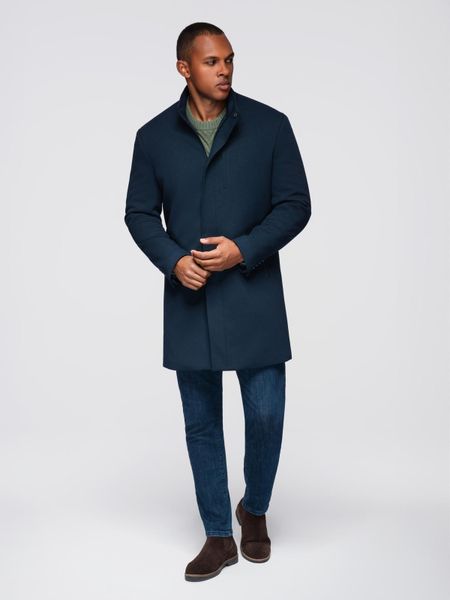 Dopasowany strukturalny płaszcz męski z wysokim kołnierzem – granatowy V2 – Rozmiar: L