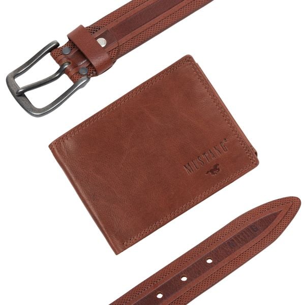 ZESTAW PREZENTOWY MUSTANG – SKÓRZANY PORTFEL I PASEK MĘSKI BROWN
