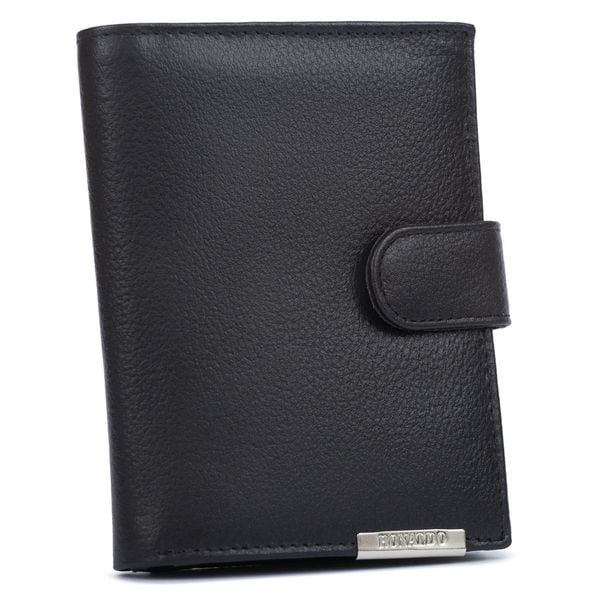 Portfel męski wykonany ze skóry naturalnej w czarnym kolorze. Model w orientacji pionowej zamykany bezpiecznym zatrzaskiem. Wyposażony w system RFID. Portfel mieści dowód rejestracyjny.
