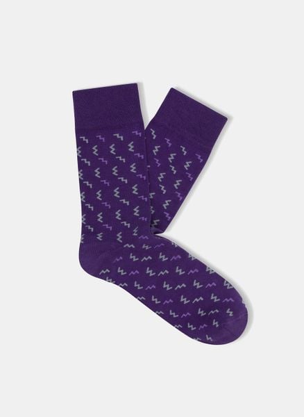 Skarpety męskie w kolorze fioletowym o stonowanym wzorze fioletowych i zielonych zygzaków. Palce oraz pięty w gładki, fioletowym kolorze. Ściągacz wysoki, świetnie utrzymujący skarpetkę na stopie. .