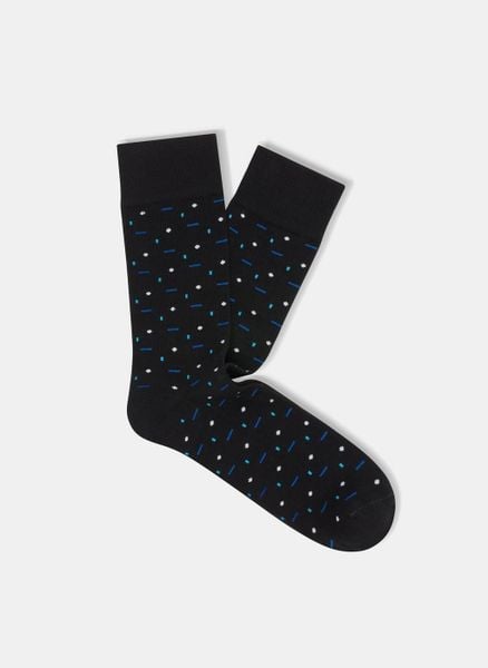 Skarpety męskie w czarnym kolorze o wzorze w niebieskie, błękitne oraz białe wzorki. Skarpetka o standardowej długości. Palce, pięty oraz ściągacz w jednolitym kolorze. Ściągacz dość wysoki, świetnie utrzymuje skarpetkę na każdej męskiej stopie.