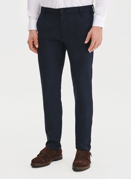 Granatowe spodnie męskie – Pako Lorente. Ciemne gładkie spodnie. Wiosenne spodnie. Skład: 66% poliester, 38% wiskoza, 2% elastan. Fason Slim.