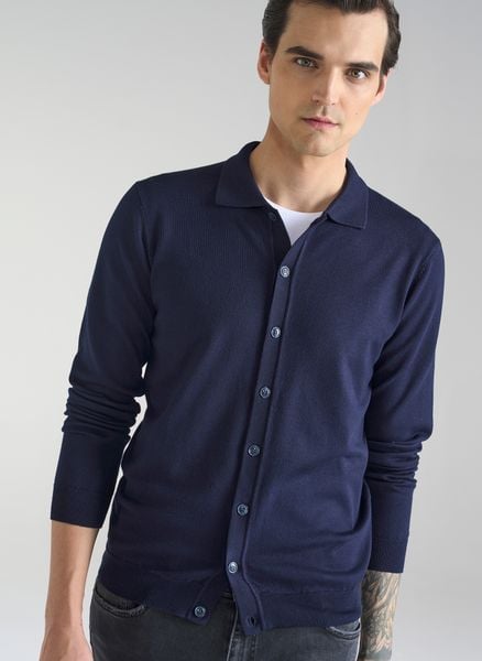 Granatowy kardigan z kołnierzykiem – Pako Lorente. Wygodny męski sweter. Rozpinany sweter. Sweter z dzianiny.