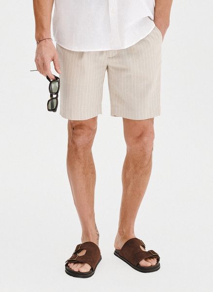 Szorty męskie z lnem – Pako Lorente. Krótkie, jasne spodenki na lato. Szorty męskie w kolorze beżowym w prążek. Skład: 50% bawełna, 42% poliester, 8% len. Prosty fason.